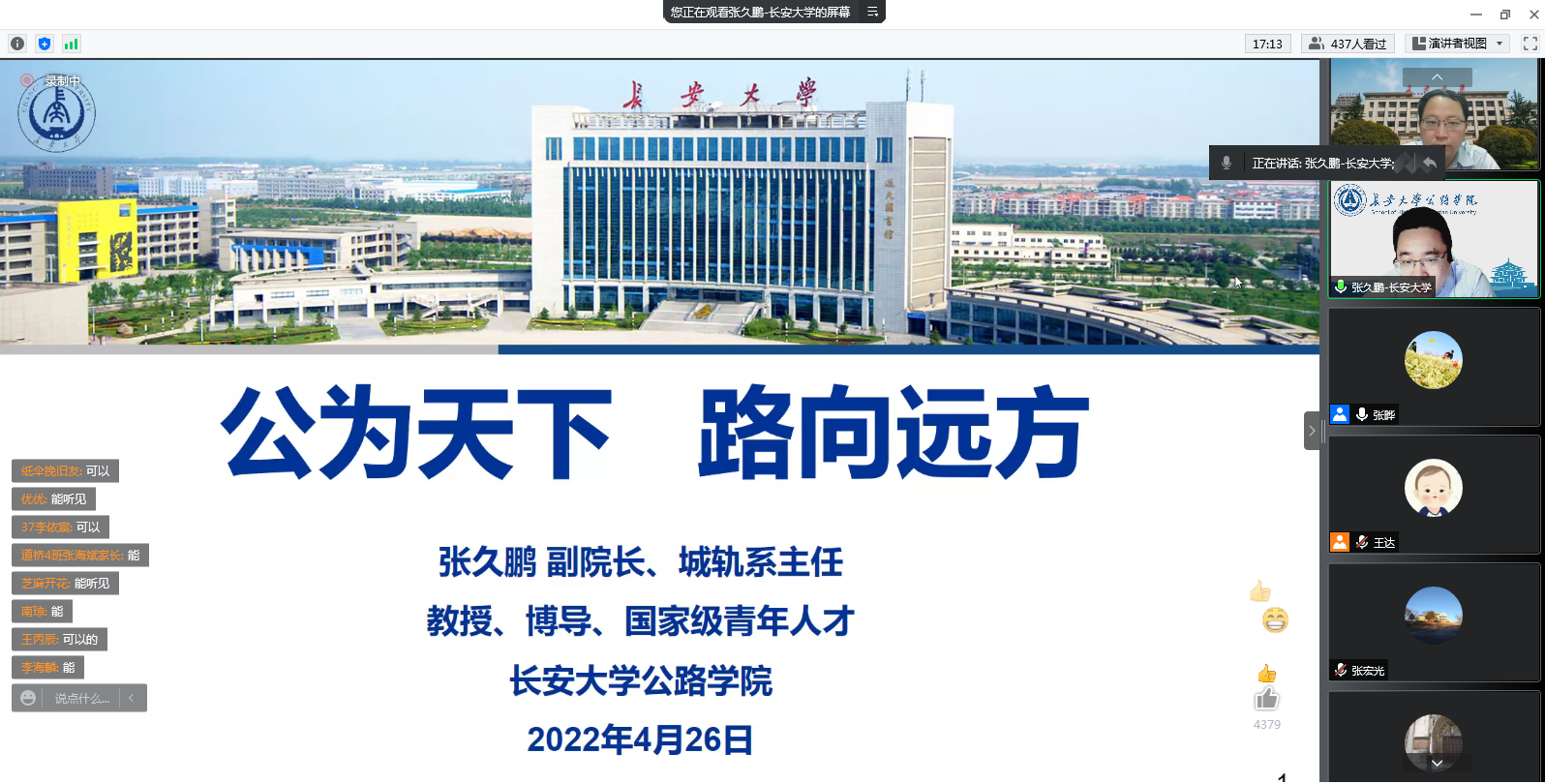 2022年4月26日21:00,学院在线上召开了2020级道路桥梁与渡河工程专业(方向)分流宣讲会。学院副院长、城市轨道工程系主任张久鹏,隧道工程系主任罗彦斌,道路工程系副主任张洪亮,岩土工程系副主任张宏光,桥梁工程系副主任陈峰,机场工程系副主任王旭昊参加会议,并作专业(方向)宣讲。2020级部分学生家长、教务工作人员、辅导员、道路桥梁与渡河工程专业学生530余人参会,会议由专业建设及教学主管张晔主持。