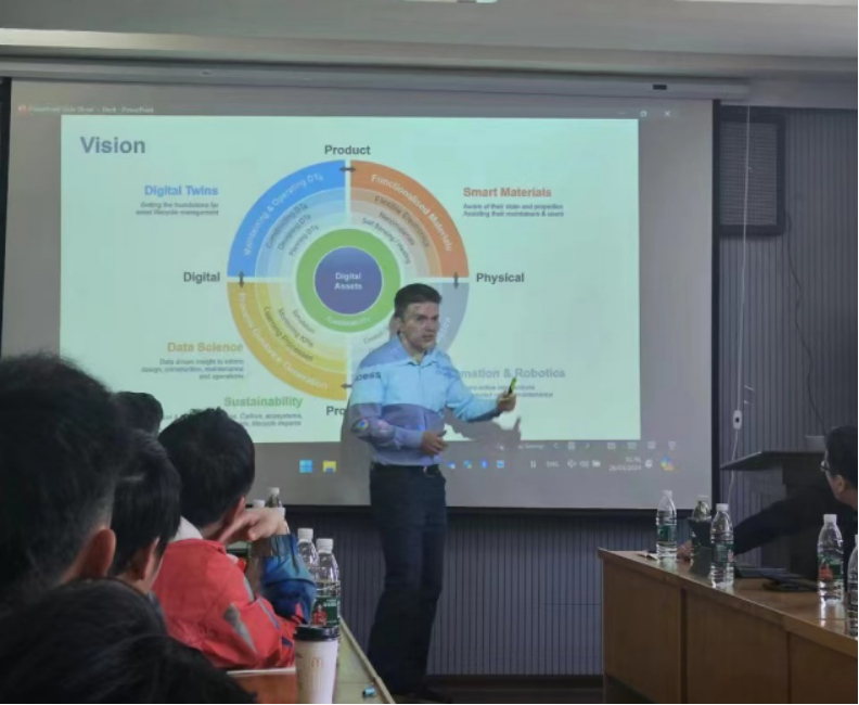 报告主要分为两部分:第一部分讲述了建筑环境中数字孪生的概念和应用价值;第二部分展示了Brilakis教授课题组在数字孪生方向的科研成果和工程应用。首先,Brilakis教授详细介绍了建筑环境中数字孪生的定义、过程、意义等。随后Brilakis教授分享了其研究课题组在数字孪生构建的各个阶段的研究成果,包括生成面向对象的基础设施几何结构,桥梁数字孪生的过程模拟和决策辅助,以及公路基础设施病害的智能识别等。Brilakis教授还简要介绍了其承担的英国和欧盟的重大项目。