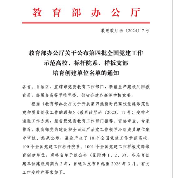 4月16日,教育部思想政治工作司发布《教育部办公厅关于公布第四批全国党建工作示范高校、标杆院系、样板支部培育创建单位名单的通知》(教思政厅函〔2024〕7号),经省级党委教育工作部门推荐、资格审查、专家推荐、教育部党的建设和全面从严治党工作领导小组成员单位集中审议、结果公示,遴选产生了10个全国党建工作示范高校、100个全国党建工作标杆院系、1001个全国党建工作样板支部培育创建单位。m88help center党委入选“全国党建工作标杆院系”培育创建单位。