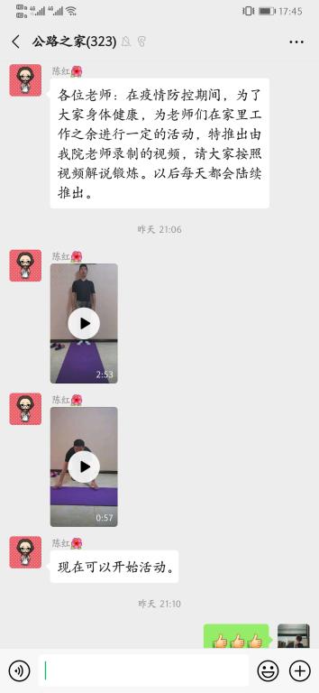 学院工会机关分会小组长张腾同志还直播或录播广播体操、太极拳等运动视频,通过网络带领学院教师积极锻炼身体,提高免疫力,缓解疫情带来的焦虑。